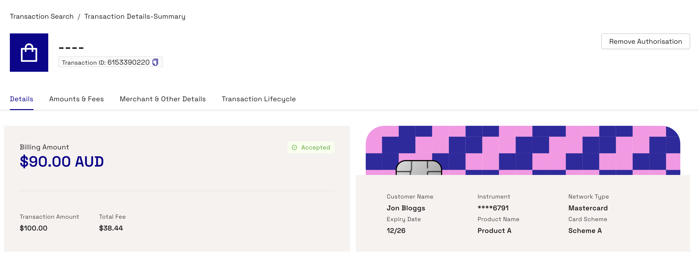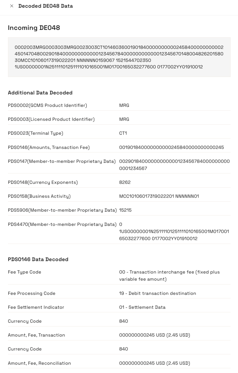 The details displayed depend on the type of transaction. For example, fields relating to presentments, such as Settlement Amount (DE005), are blank for authorisations.