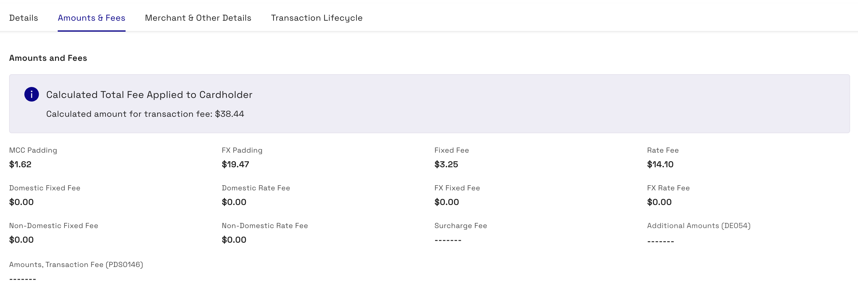 The Amounts & Fees tab contains details on the fees associated with the transaction.