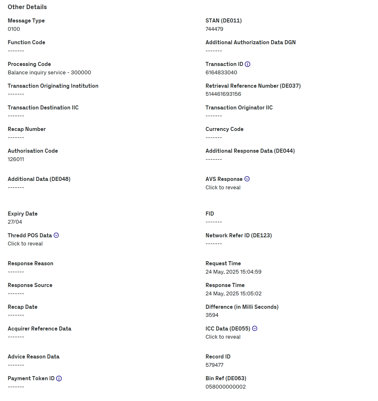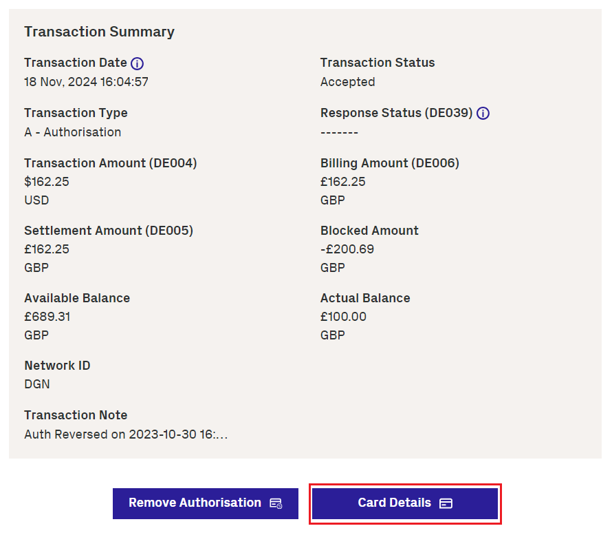 The details displayed depend on the type of transaction. For example, fields relating to presentments, such as Settlement Amount (DE005), are blank for authorisations.