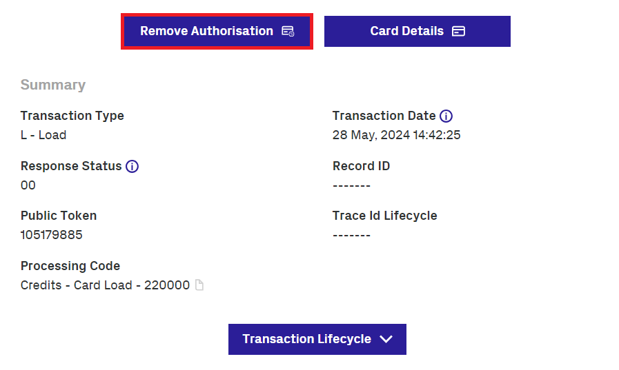 In some instances, you may want to remove an authorisation on a transaction if the authorisation is no longer required. The Remove Transaction Authorisation functionality enables you to remove an authorisation from a transaction. This functionality is only enabled for Authorisation transactions. If the transaction is anything else then the field will be disabled.