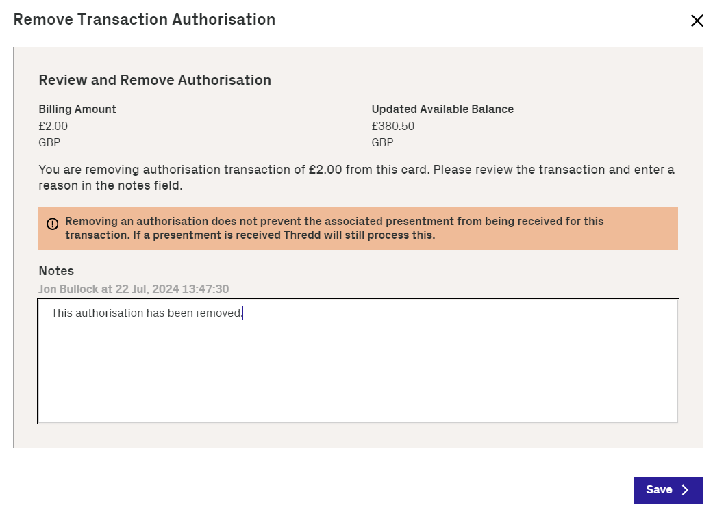 Click Save to remove the authorisation from the transaction.
