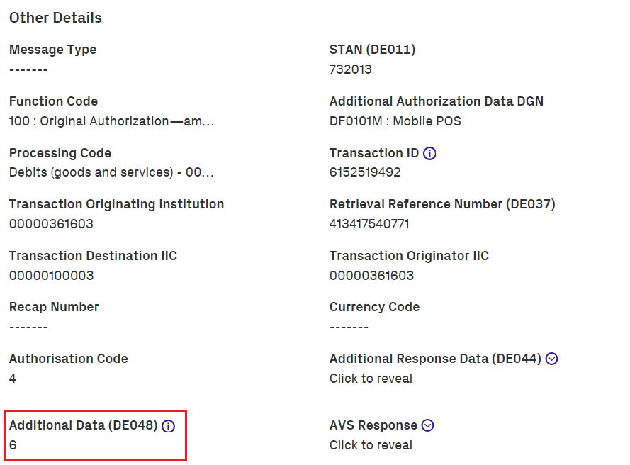 In the Transaction Details, inspect the Additional Data (DE048) field.
