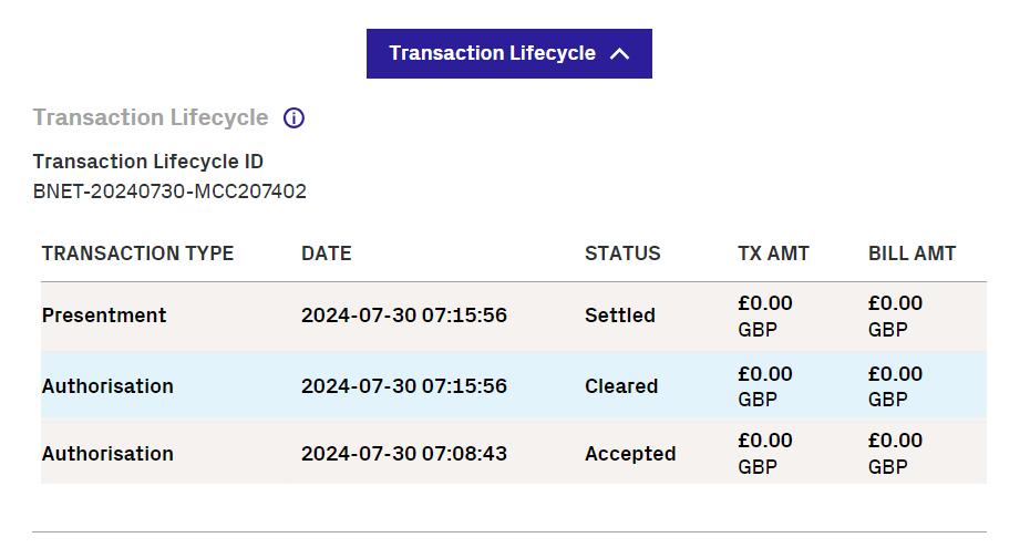 Click on the different transaction types to display information on that part of the transaction details. The Transaction Details will update depending on the part of the lifecycle you select.