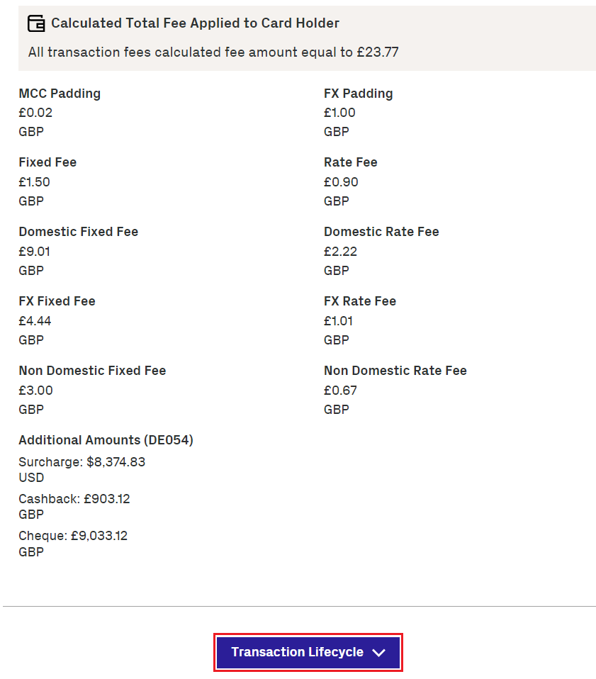 View the transaction details. The Transaction Lifecycle button displays below the Amount and Fees section.