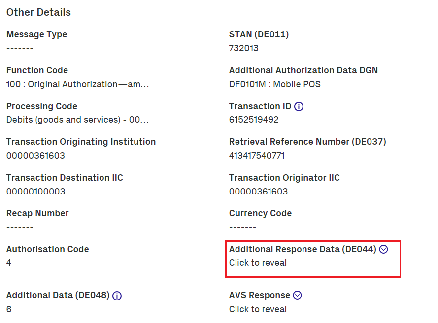 In Other Details, click the Additional Response Data (DE044) field.