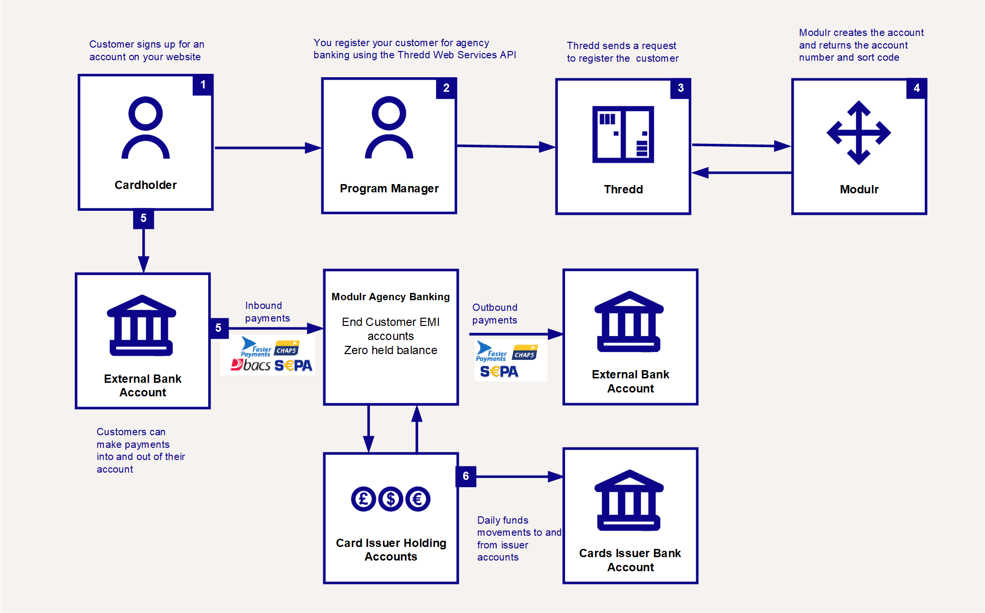 The agency banking solution is provided via our partner Modulr and is fully integrated into the Thredd system. It is available to customers in the UK and EU.