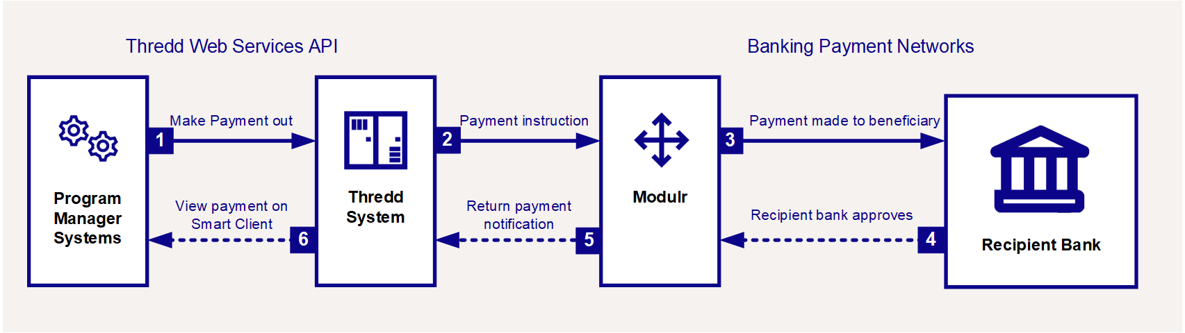Modulr returns a payment notification to Thredd. Thredd updates its systems.